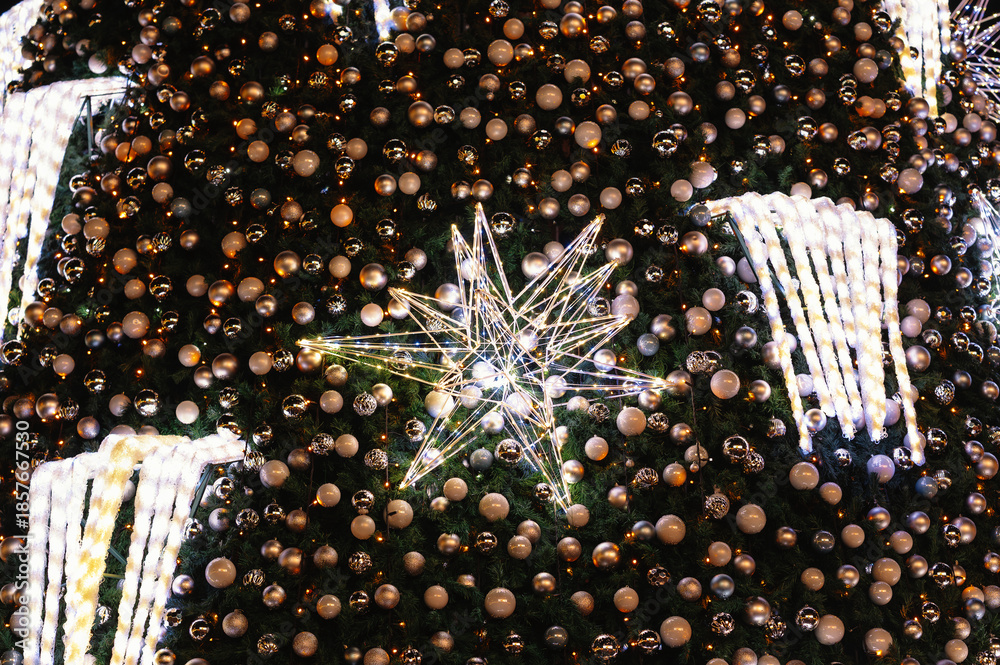 Giant Illuminated Christmas Tree At Night With Star Topper And Cascading Lights, Dense Bokeh Background, Vertical Light
