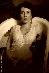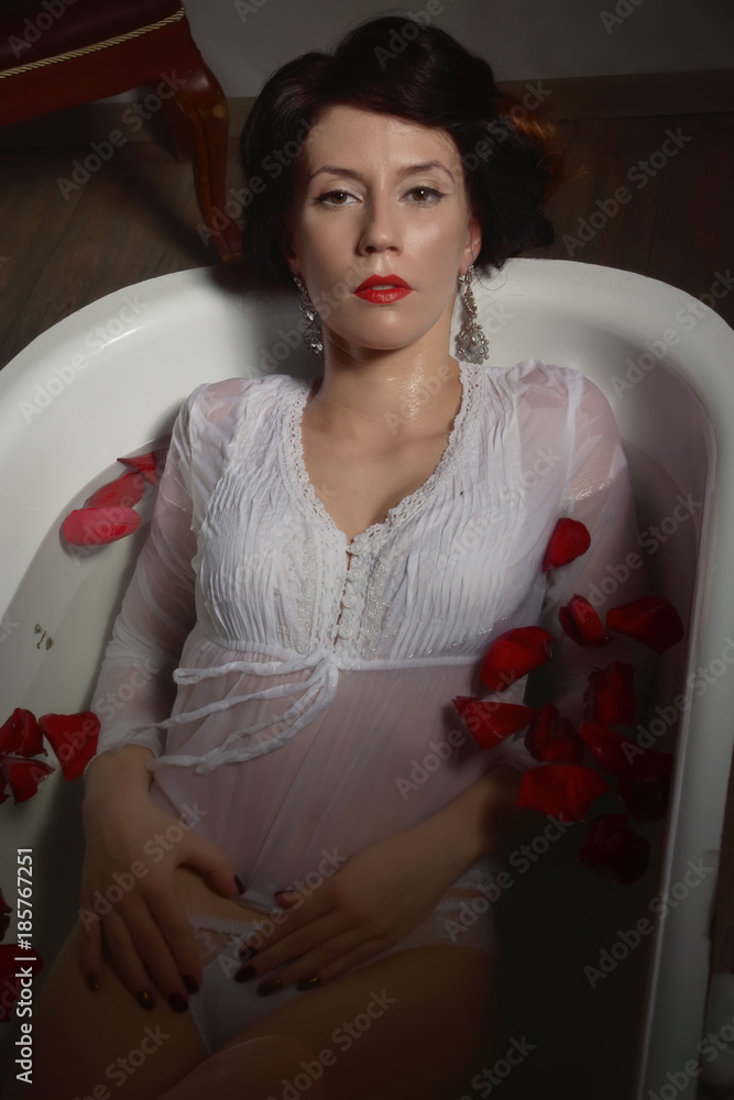 Beautiful sexy woman in vintage bathroom with flowers petals