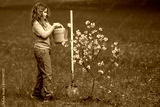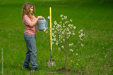 Child planting and watering tree in the garden. Spring activity of planting trees. Child work with shovel and watering can. Child planting fruit tree. Gardening kids. Child planting and care for tree.