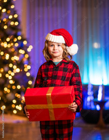 Kid in Santa hat with gift box. Child celebrating Christmas. Child with gift near Christmas tree. Little Santa holding holiday gifts. Kids Christmas present.