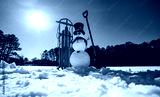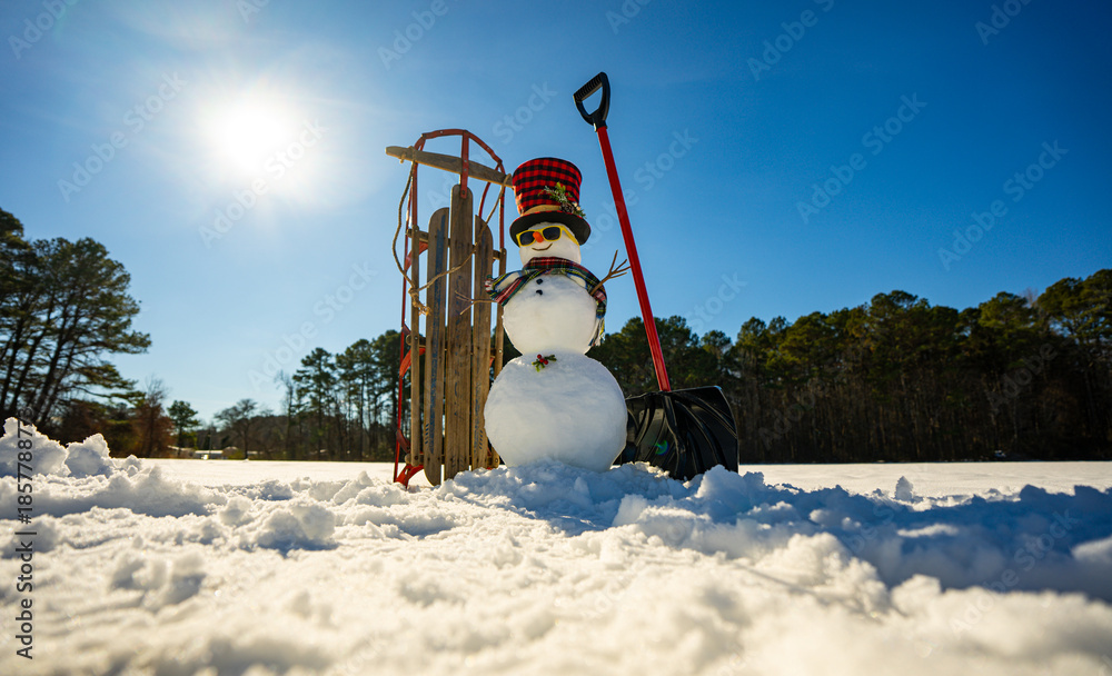 Snowman clearing snow with shovel. Snowman helping to clean the snowy road. Cute snowman prepared for snow removal. Winter scene with snowman with snow shovel and sled.
