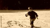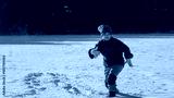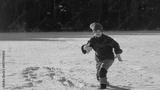 Child play in snowy park. Kid plays in falling snowflakes. Winter fun. Portrait of kid in winter. Outdoors kid laughter and motion. Emotional moments in frozen nature. Kids winter activities.