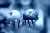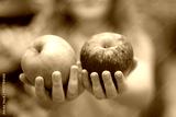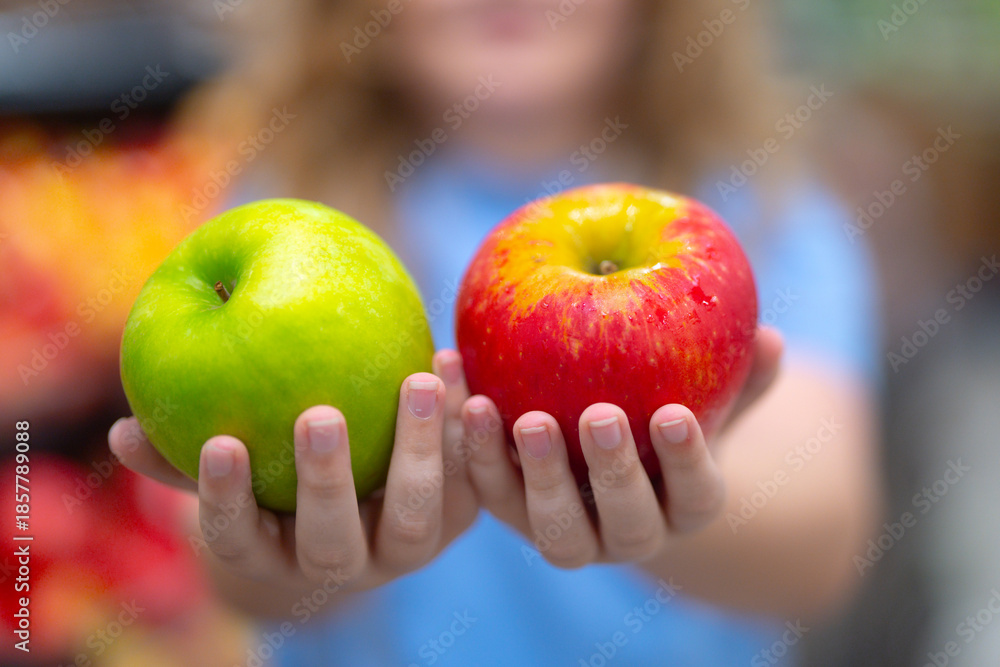Kid holding a fresh apple. Red and green apples in kids hand. Selective focus on apples and hand. Apple close-up, selective focus on apple. Apples in kids hands. Child choosing a apple.