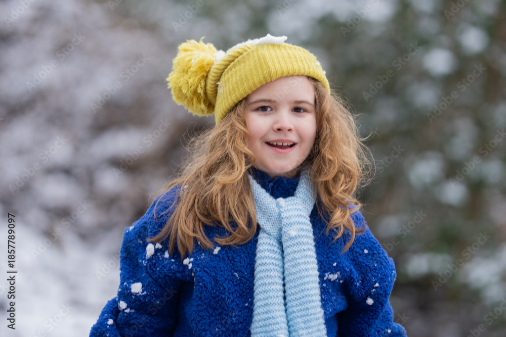 Kid enjoying the cold weather during winter play. Kid winter activity. Kid winter face outdoor portrait. Child winter portrait.