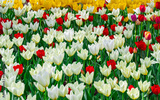 Vivid tulips spring background. Blooming tulip field in spring season. Multicolored tulips natural paint background. Spring meadow full of tulip flowers. Floral background with multicolored tulips.