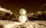 Cute snowman. Winter snowman holiday scene. Snowman standing in fresh snow. Christmas snowman decoration outdoors. Frosty morning background.