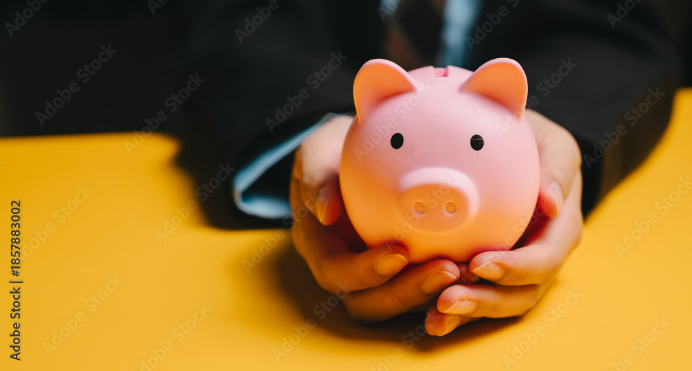 Pink piggy bank held by hands on yellow surface symbolizing saving money and financial security