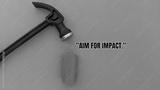 Hammer above red cylinder on blue background conveys precision, strength, and purposeful impact with motivational message.