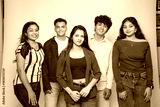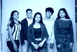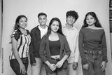 Group of young indian gen z friends standing together on a white background looking at camera.