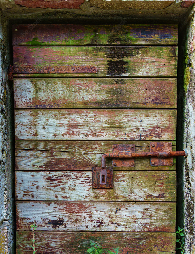 wooden door, old weathered and cracked boards painted red and green color for background or texture