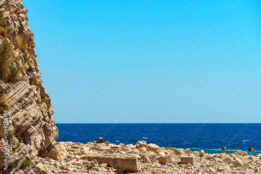 beautiful summer landscape of rocky sea coast, rocks on the edge of cliff, view onto water and waves, bright sunny day