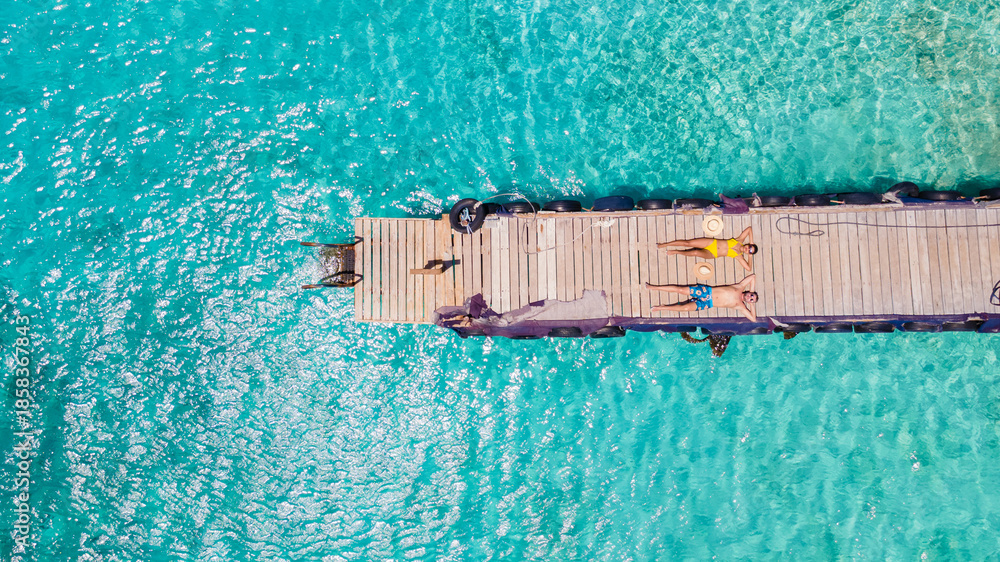 Bright sunshine fills the sky as visitors relax on the dock at Playa Kalki Beach in Westpunt, Curacao. Crystal-clear waters invite you to enjoy the beauty of this Caribbean paradise. Drone top view