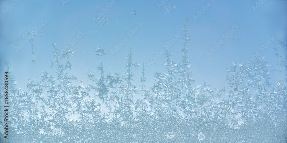 Close up photo of ice crystals on a frosty window pane surface, icy pattern, cold winter abstract background