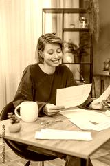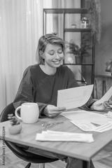 Young satisfied woman happily reviewing financial documents sitting at home table, smiling . Caucasian girl positively excited about good financial results, demonstrating successful money management.