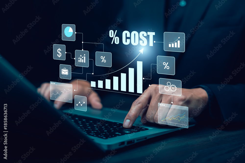 Cost management and business analytics concept with professional using laptop and virtual data interface, showing expense control, performance analysis, optimization strategy and financial decision ma