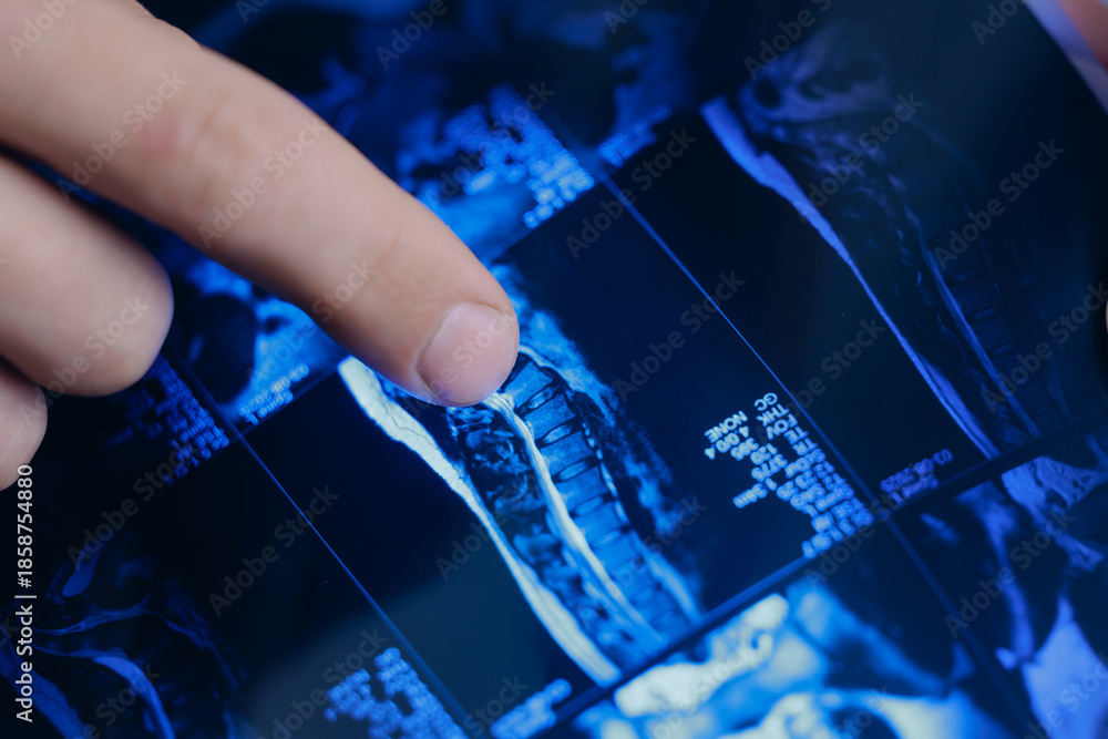 Human spine mri analysis with caucasian adult male hand pointing doctor, top view