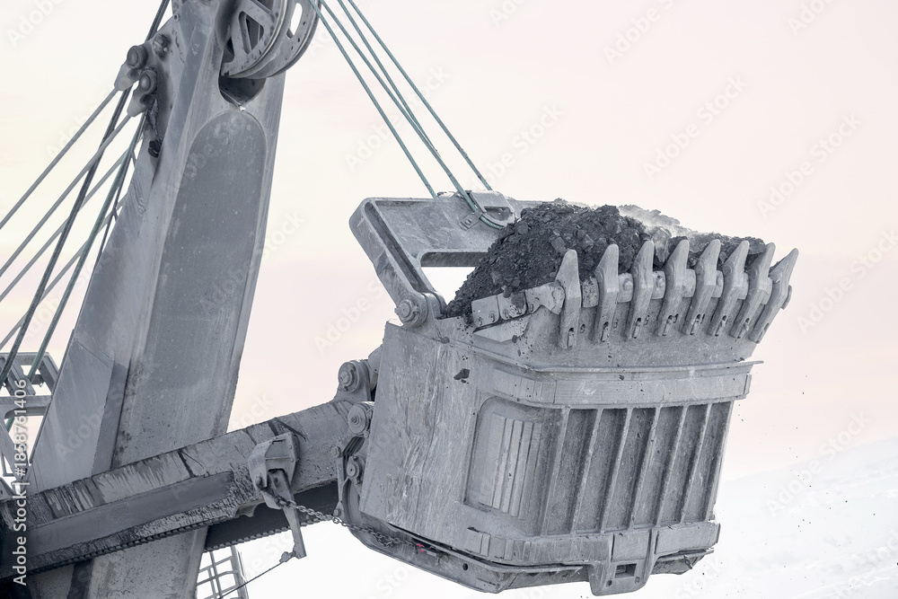 Coal mining excavator in winter scene at open pit mine