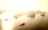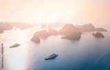 Serene Halong bay seascape with sailing yachts at sunset, Vietnam