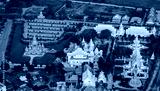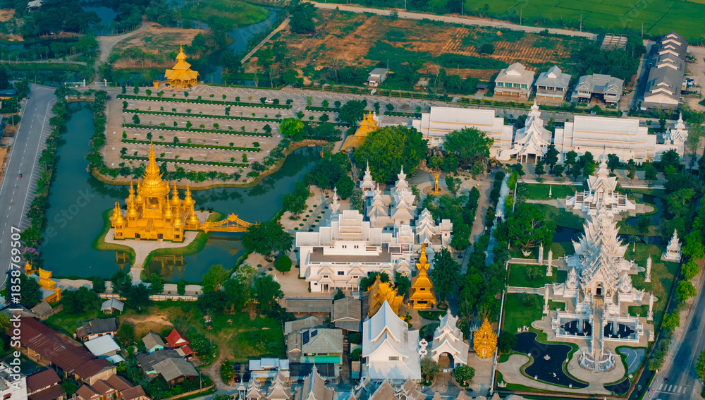 Aerial view of wat rong khun, stunning white temple in Chiang Rai, Thailand