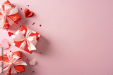Red gift boxes tied with pale pink ribbons lie on a pastel pink backdrop, evoking Valentine’s Day warmth and romance. Perfect for gifts, greetings, and festive celebrations