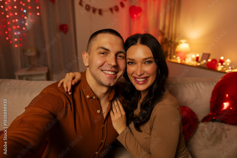 Loving couple taking selfie in room decorated with hearts and lights, celebrating Valentine's day at home