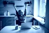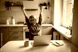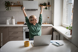 Satisfied middle aged businesswoman warming up body after successfully finishing work tasks and projects on laptop. Cheerful female worker stretching arms muscles, taking break from work on computer.