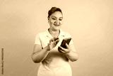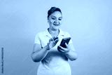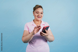 portrait of adult latin woman holding and using mobile phone on blue background in Mexico Latin America, hispanic and mexican female