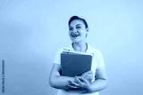 Mexican business woman holding folders posing isolated over blue background in Mexico Latin America