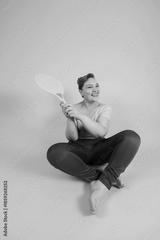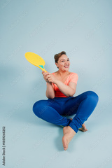 portrait of adult latin woman in sportswear and holding a racket on blue background in Mexico Latin America, hispanic female sitting