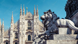 Piazza del Duomo in Milan, Italy. Panorama of Milan cathedral and lion sculpture.
