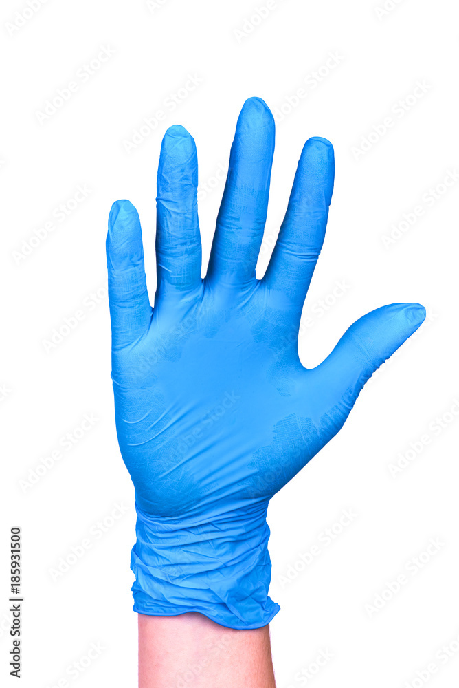 Gesture greeting hand in a blue glove