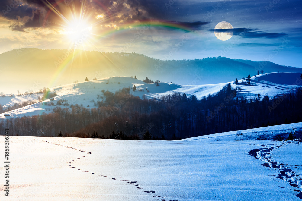 beautiful winter landscape with snow covered rolling hills. day and night time change concept. majestic mountains with sun and moon. frosty countryside scenery. harmony and progress calendar