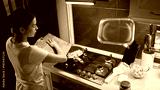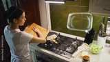 Woman using tablet with AI cooking assistant while preparing vegetables in modern kitchen. Concept of personalized digital support, smart food preparation, AI lifestyle integration, healthy habits