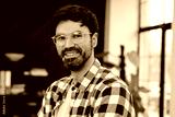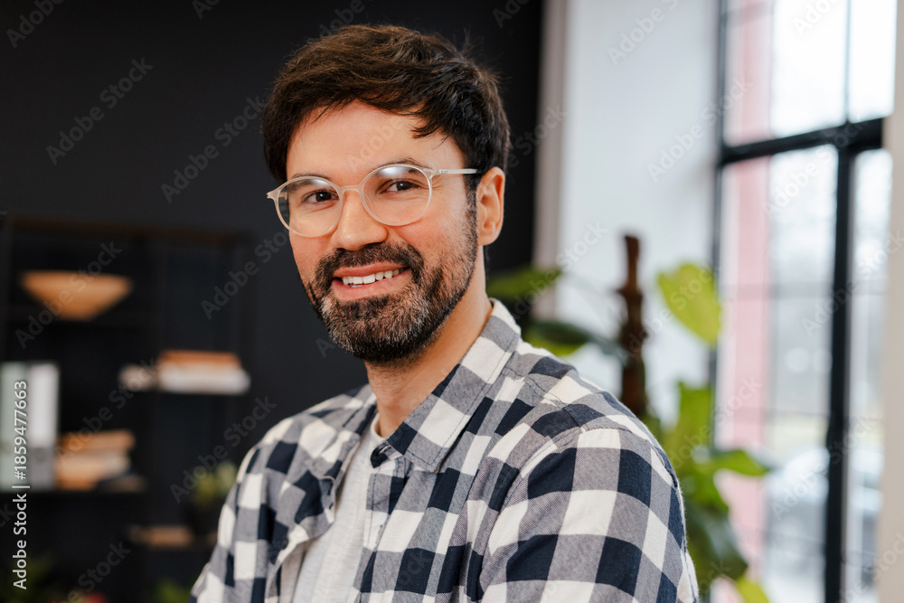Smiling man wearing eyeglasses wearing stylish shirt looking at camera working in modern office