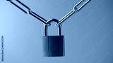 A closed padlock hangs on chains on an orange background.