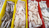 Several slices of frozen fish are displayed on the counter of a fishmonger's shop in a traditional market setting. A fish retail scene with details highlighting different cuts.