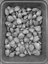 A tray of frozen Fasolari on display at a fishmonger's, photographed in a market setting. Seafood retail.