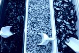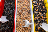 Different types of frozen mussels displayed on a fishmonger's counter in a traditional market setting, closed, shelled, and open. Image of a seafood retail outlet.