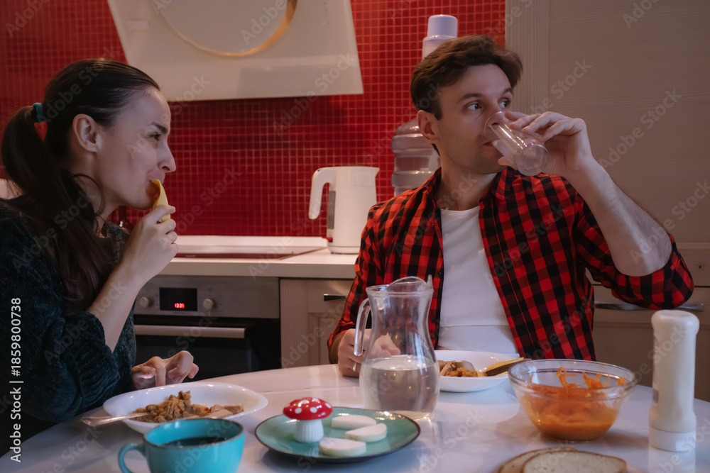 Young couple eating together in home kitchen, casual domestic lifestyle, everyday routine and family life concept.