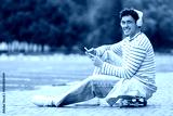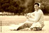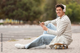 Happy young man in headphones with mobile phone sitting on skateboard outdoors