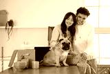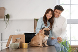 Young couple with French bulldog sitting in kitchen of rented apartment on moving day