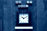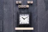 Cubes with text DO IT NOW and alarm clock on black wooden background. Top view