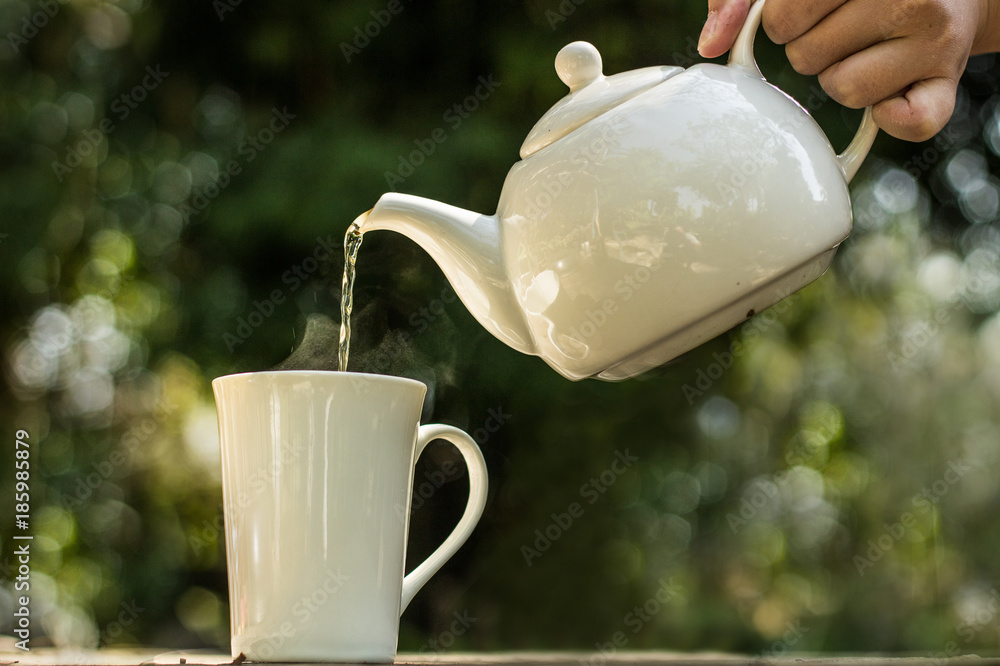 Woman hand rinses the White ceramic teapot before brewing the hot tea in to white cup with morning sunlight