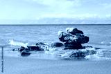 Rock formation on a sandy beach shore with calm ocean waves rolling in. Serene coastal landscape for travel and nature themes.