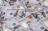 Money background with dollar bills. Texture of US dollars. 100 USD banknotes in focus. American hundred-dollars notes spread on a table. Pattern of US dollars for finance concept. Dollars currency.