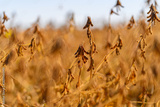 Sunlit soybean pods glow warmly, Clusters of soybeans under warm amber light in soft focus, Sunkissed soybean seed groups with mellow bokeh and inviting field scenery