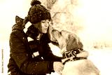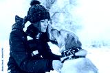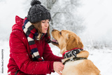 Girl in red jacket, hat and scarf playing among snow in garden with golden Labrador retriever dog. Woman spending time with lovely pet outdoors. Yellow dog is symbol of New year 2018.