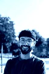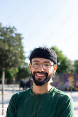 Vertical headshot portrait of happy young caucasian man outdoors looking at camera smiling.