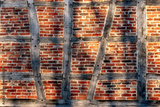 Ansicht einer fensterlosen Außen- oder Hauswand eines mitelalterlichen Fachwerksbaus mit Gefachen, und leicht verwitterten Holzbalken