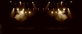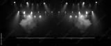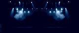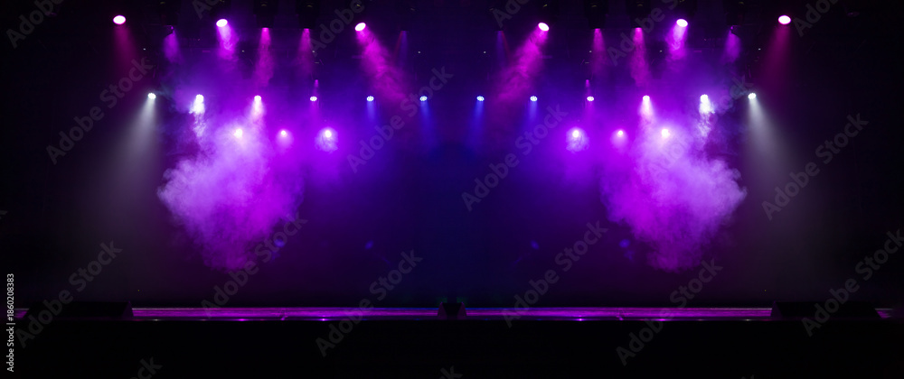 An empty stage of the theater, lit by spotlights and smoke before the performance